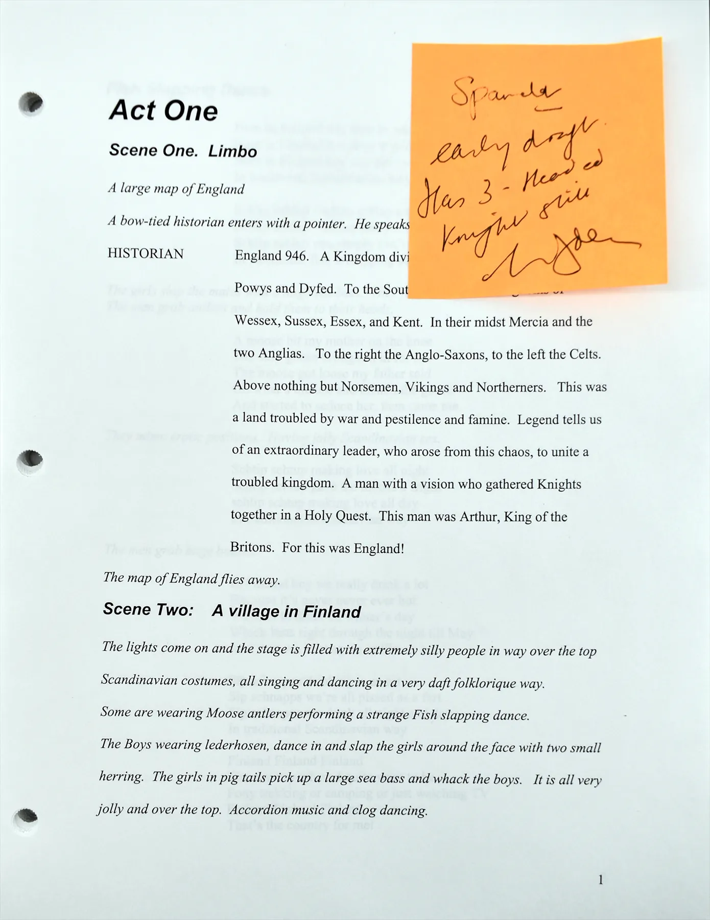 Early draft of Spamalot, circa 2001. Eric noted that this version still contained a three-headed knight character.