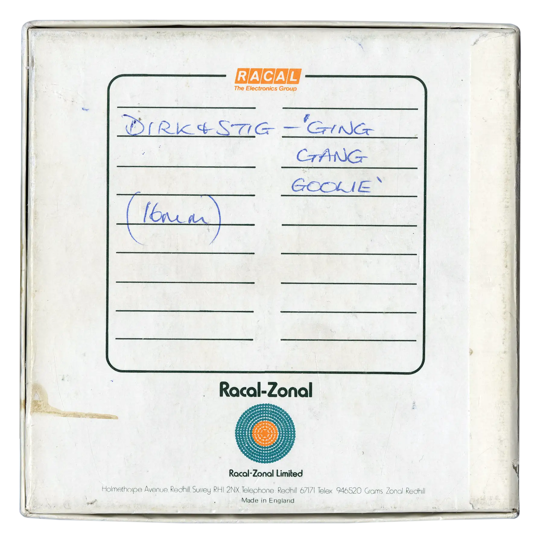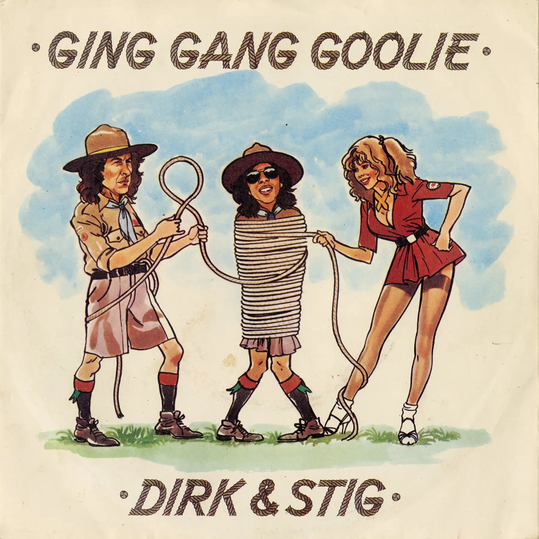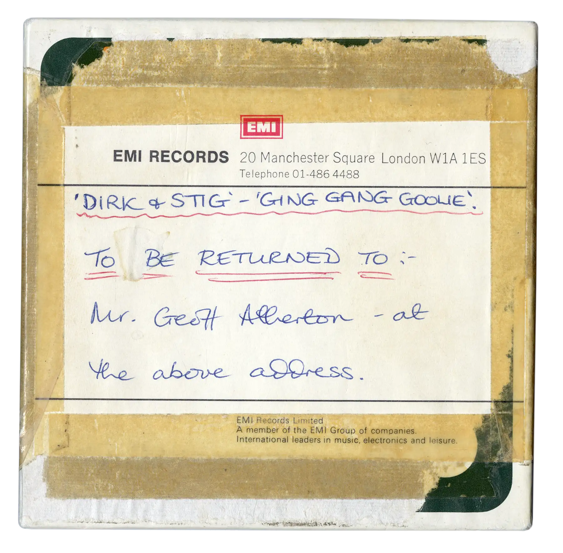 Material related to “Ging Gang Goolie” by Dirk and Stig, one of the first mainstream solo projects following the breakup of The Rutles. The EP was issued by EMI and packaged with a second track, “Mr. Sheene,” a musical tribute to motorcycle racer Barry Sheene.