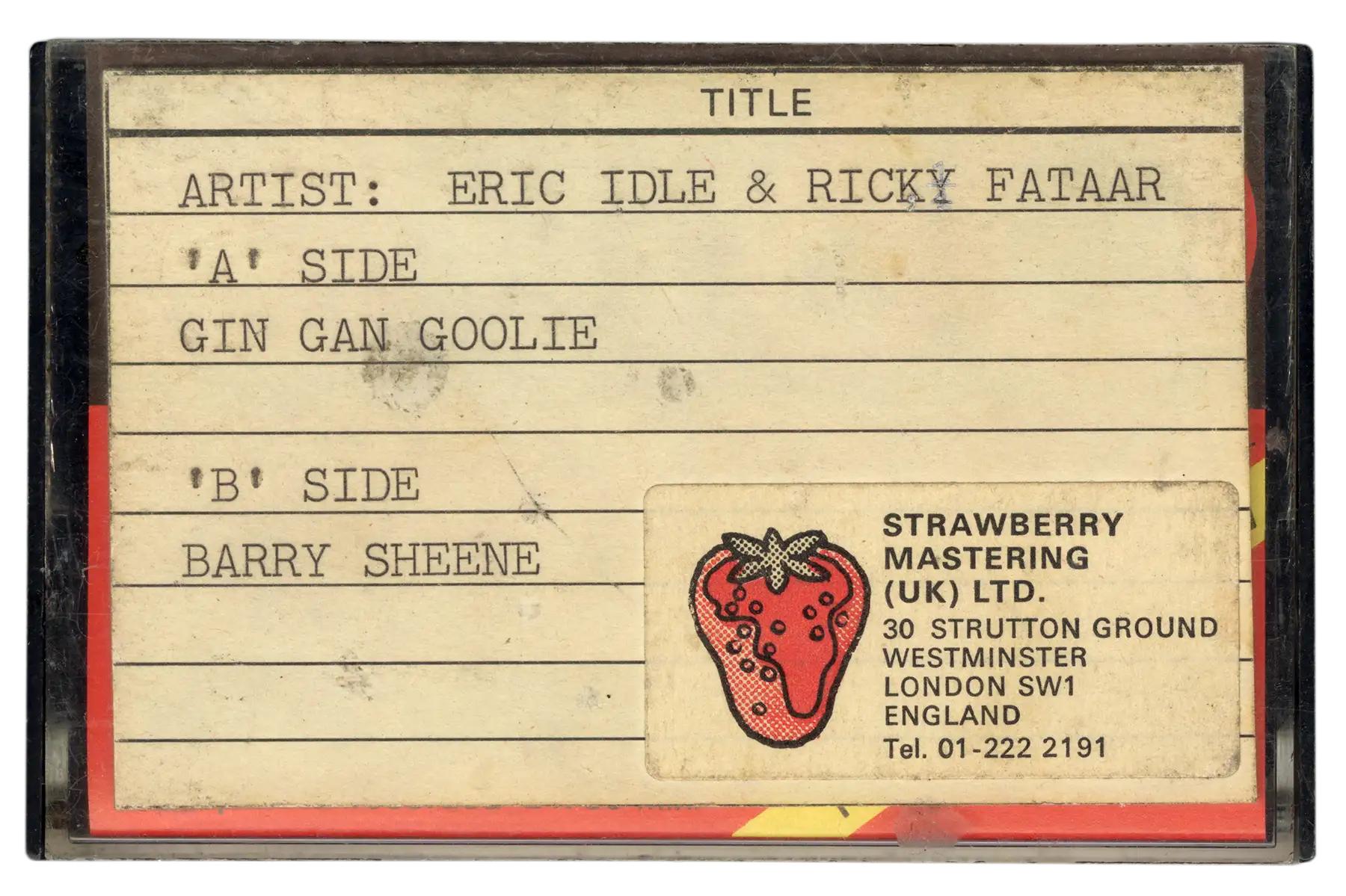Included are one factory sample EP, a 16mm film reel shot at Friar Park (George Harrison’s home), one audiocassette from Strawberry Mastering Ltd., and a promotional button.
