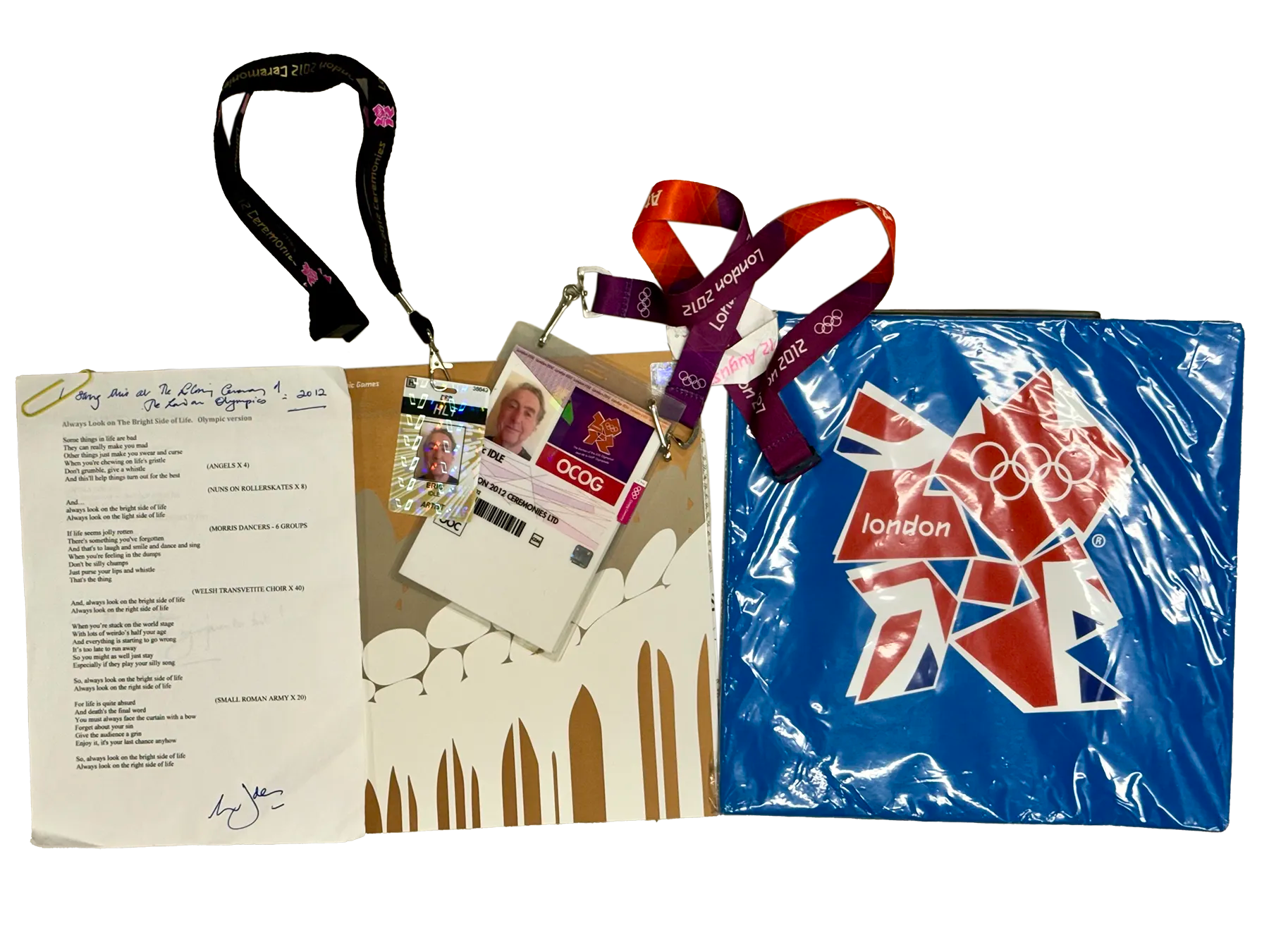 Eric Idle's script, laminate passes, and sealed 2012 London Olympics t-shirt, mementos from his closing ceremony performance of "Always Look on the Bright Side of Life." The special rendition included roller skating nuns, Bollywood dancers, a human cannonball, and an audience of 80,000 people singing along.