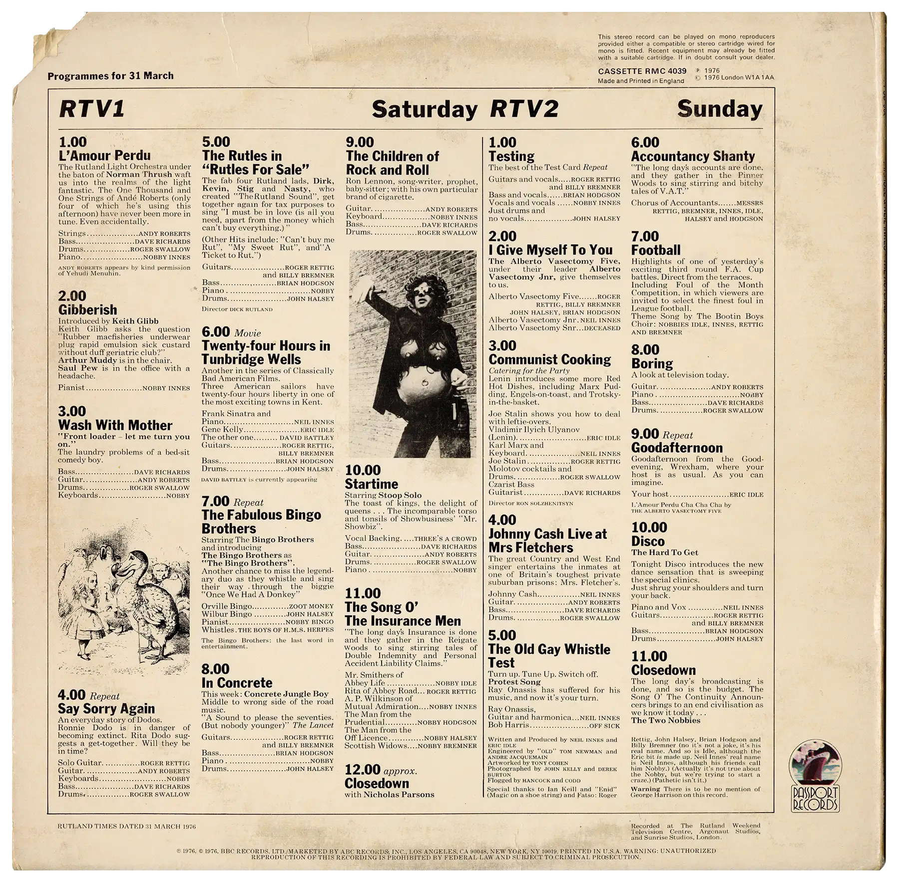 Also known as Rutland Times, Eric's copy of The Rutland Weekend Songbook LP was released in 1976 on BBC Records. Written and performed by Eric Idle and Neil Innes, the album features “I Must Be in Love” and an early version of the Rutles’ “Good Times Roll,” titled “The Children of Rock ’n’ Roll.” Includes Definitive Authentic Certificate of Authenticity.