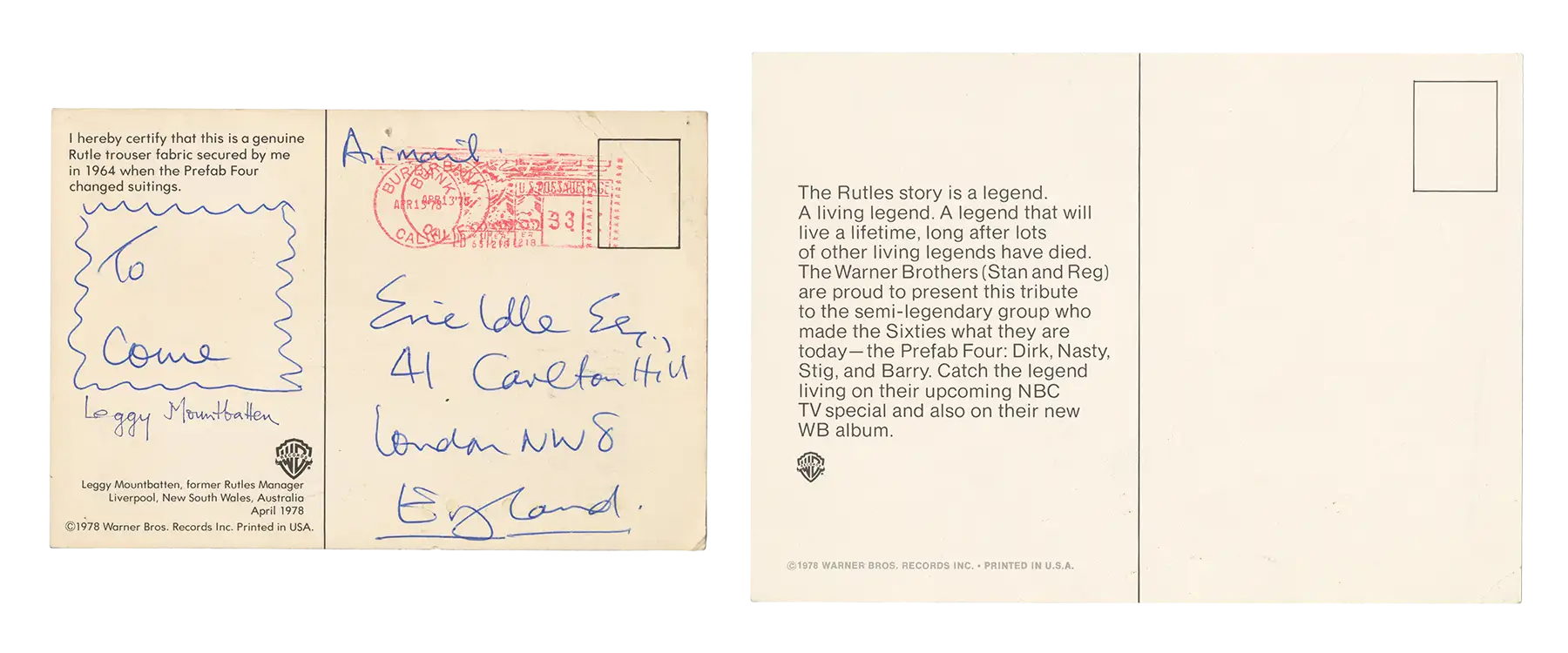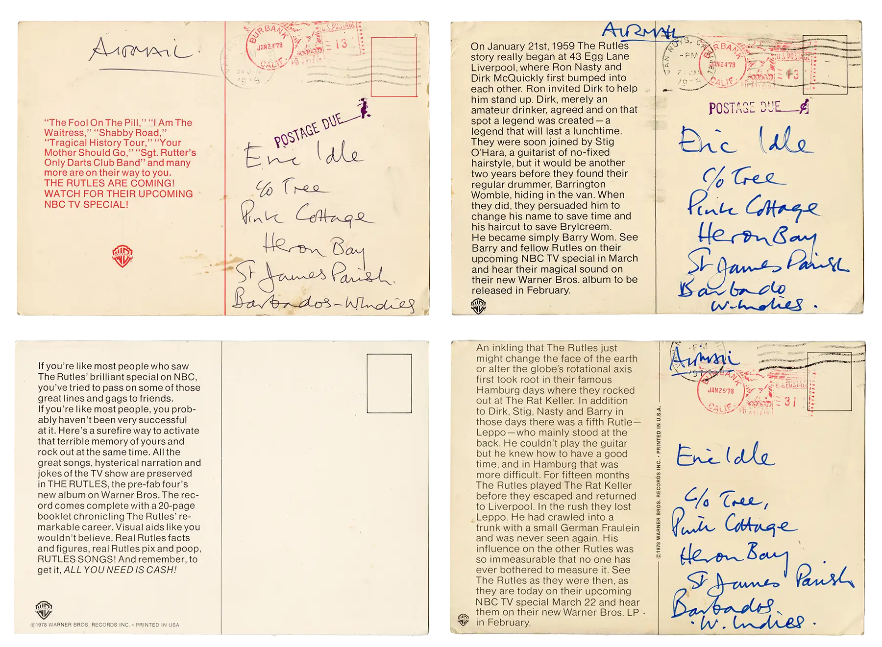 Promotional Rutles postcards produced by Beatles press agent, Derek Taylor.