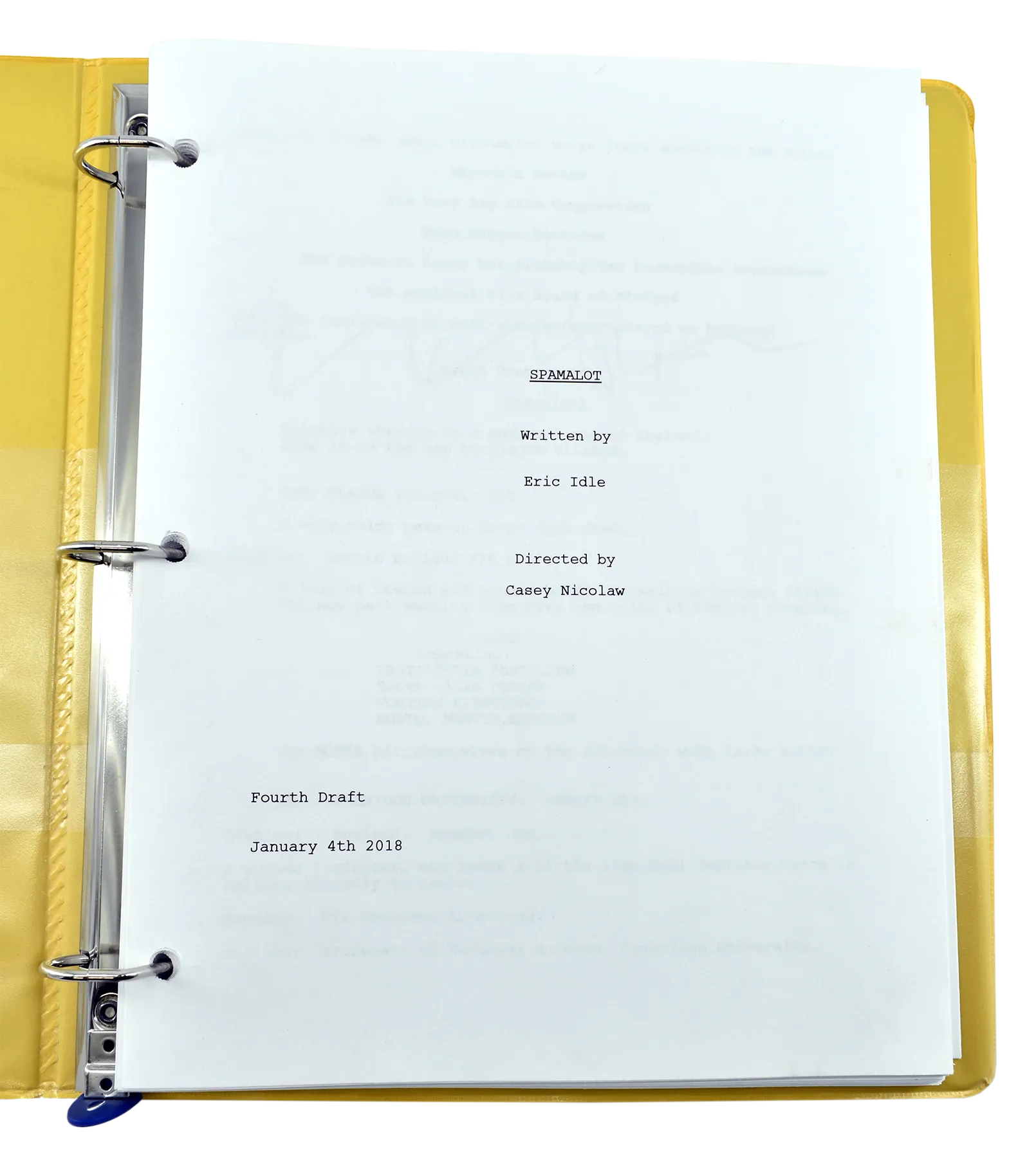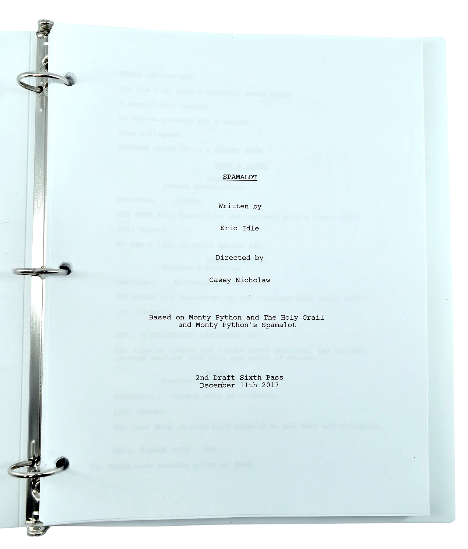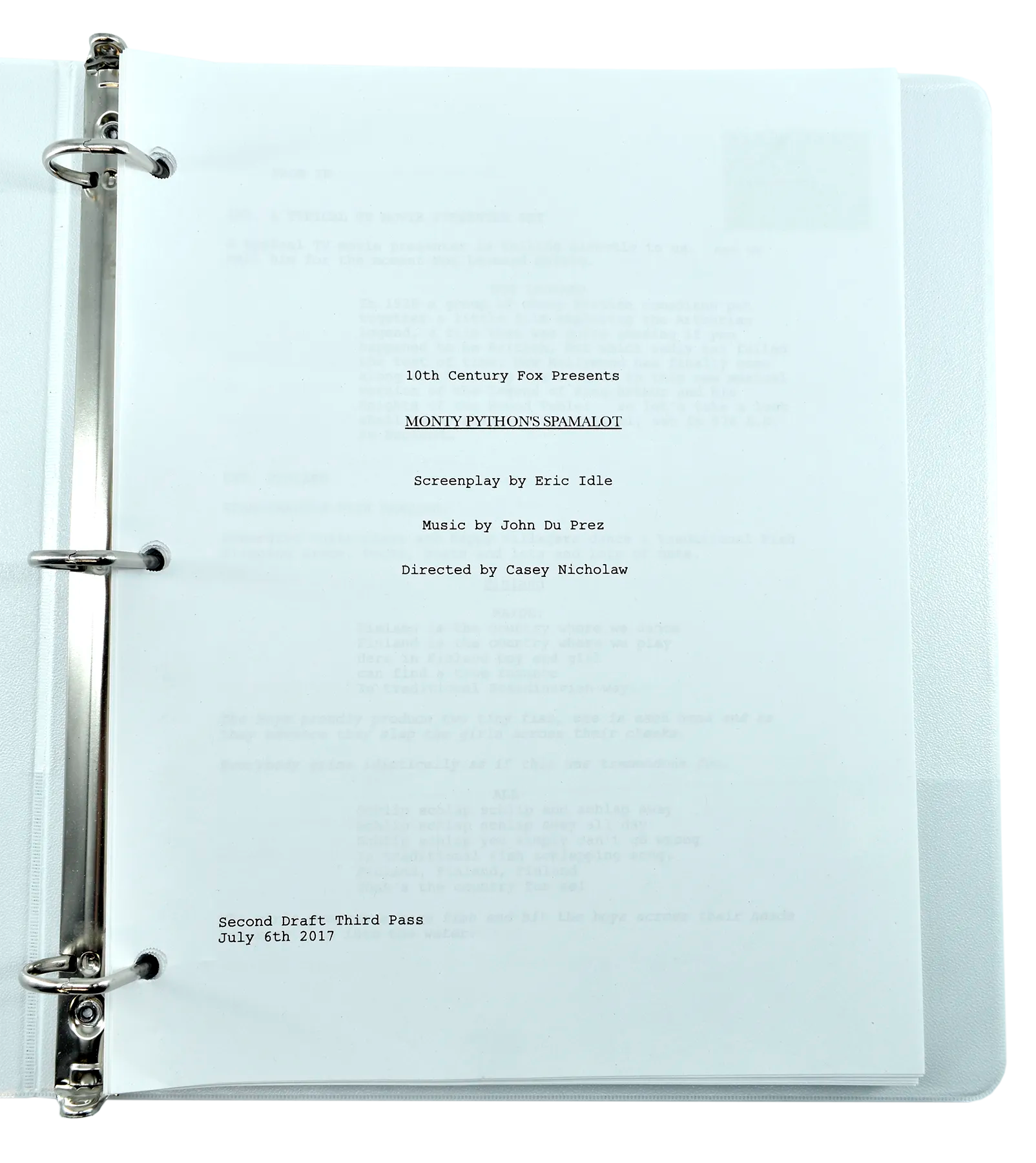 Loose-leaf binders containing various drafts of the screenplay adaptation of Spamalot, 2016 - 2018.