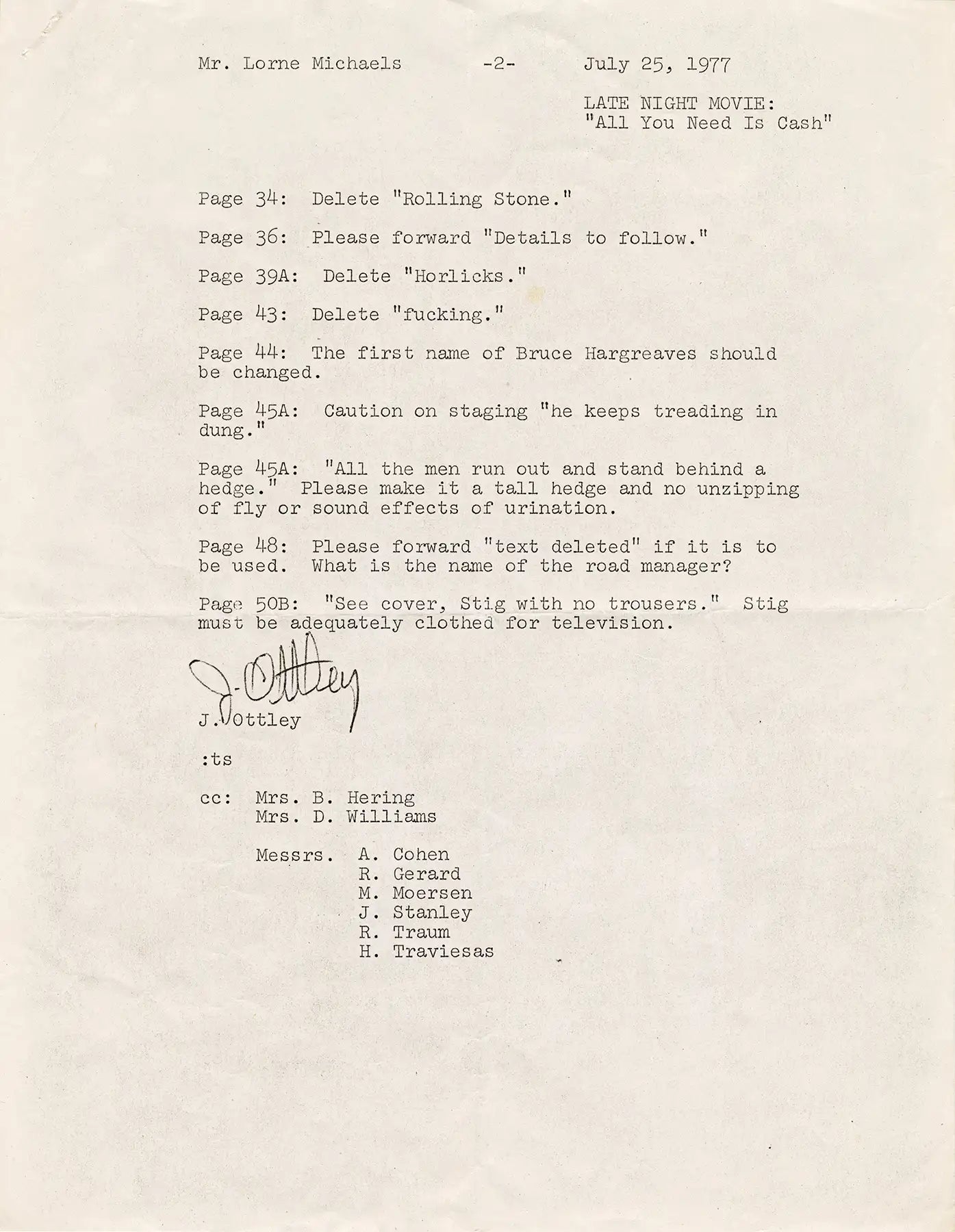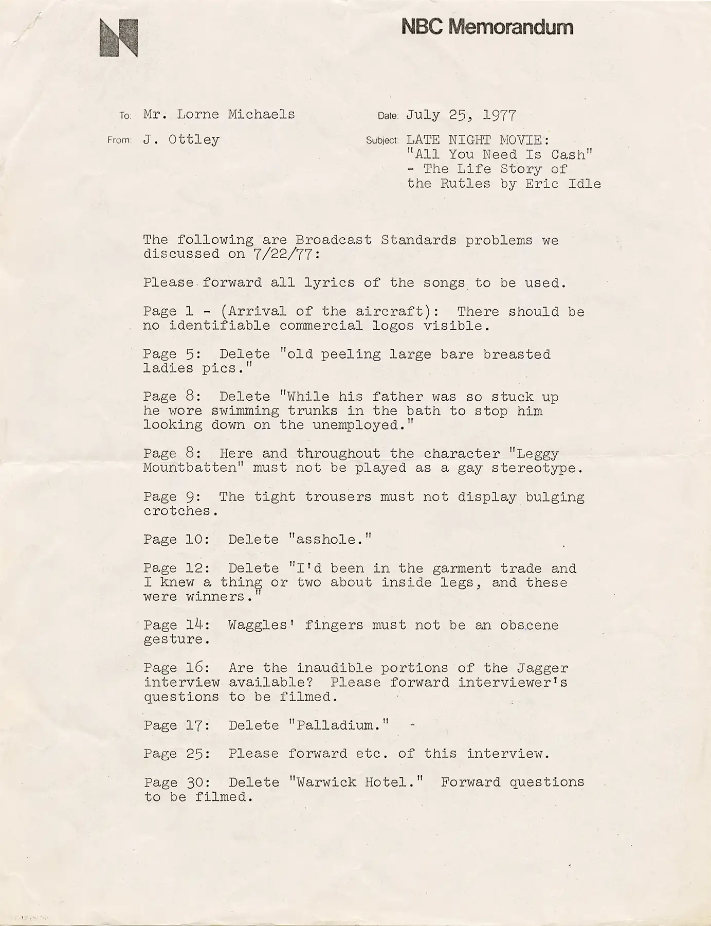Two internal memorandums from NBC related to the broadcast of All You Need Is Cash. One addresses concerns from Broadcast Standards; the other outlines technical requirements for delivery.